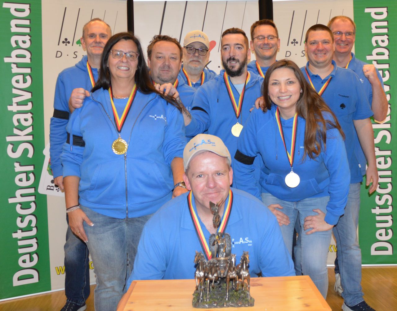Insgesamt haben 34 Mannschaften jeweils bestehend aus 8-10 Skatspielern an der Endrunde in Eppertshausen teilgenommen. Nur 5 teilnehmende Mannschaften waren reine Vereinsmannschaften. In 5 Serien wurden die Sieger ermittelt. Allein 11 Mannschaften aus unserem Landesverband 04 hatten sich zuvor für diese Endrunde qualifiziert. Die Mannschaft aus Recklinghausen konnte sich klar durchsetzen gegen die Mannschaft aus Dieburg. Eine Vereins-Mannschaft aus Dieburg war in den letzten Jahren schon mal häufiger ganz oben. Nach der ersten Serie schien es so, als sollte sie wieder Meister werden. Doch seit der 2. Serie stand fortan oben immer die Mannschaft aus Recklinghausen. Sie gewann das Städtepokalturnier schließlich mit 42014 Punkten vor der Vereinsmannschaft aus Dieburg, die am Ende 40157 Punkte aufweisen konnten.